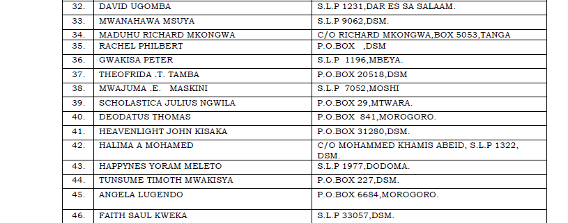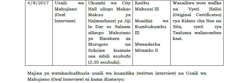Home Unlabelled MAJINA YA WAOMBAJI KAZI WALIOITWA KWENYE USAILI HALMASHAURI YA JIJI LA DAR ES SALAAM MAJINA YA WAOMBAJI KAZI WALIOITWA KWENYE USAILI HALMASHAURI YA JIJI LA DAR ES SALAAM August 27, 2017 A+ A- Print Email Tangazo la kuitwa kwenye usaili 25 August 2017 Tweet Share Share Share Share Share